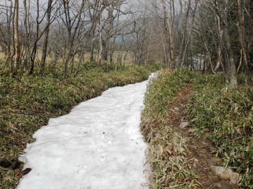 山頂からは大沼登山口方面へ下がって行きますが・・・。途中、残雪がゴロ岩を覆って滑るので山頂へ引き返す事にし、八丁峠に戻ります。