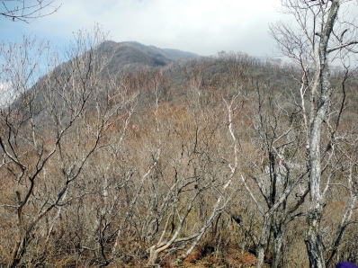 黒檜山登山口と合流すると雪融けで、ヌカヌカ道になっています。赤城神社の関係者とすれ違い、本日は「赤城山の山開き」の日だそうです。「山開き・赤城大明神」と書かれた「たいまつ風」の棒を、駒ケ岳山頂に設置されに行くそうです。黒檜山山頂は予想通り視界不良!周辺の山々は全く見えませんので、北側展望台へ行くのは止めました。