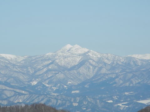 スノーシューが無くても大丈夫と判断して、新坂平駐車場にてアイゼンを装着します。スノーシューは車へ! 先行者がつけてくれたトレースを辿り、ふわふわ雪を踏みしめながら歩きます。姥子峠先の右側に入った所に黒檜山方面の景色を一望出来る見晴台があり、先行者の陽気なグループが、眺望を楽しんでいました。正面に見えるのは黒檜山!