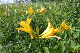 | 空と湖の青さだけでも感動ものですが、湖岸には野反湖にちなんで、野反キスゲ(ニッコウキスゲ)の花が咲いていました。野反湖は群馬県の北部の山地にあります。 |