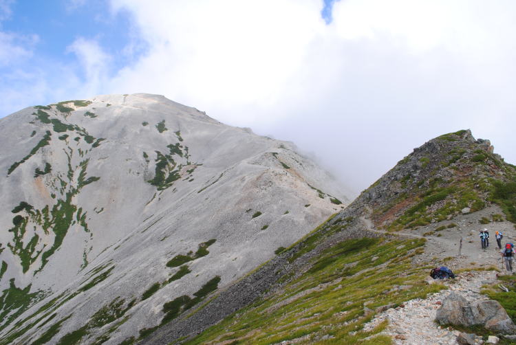 杓子岳、白馬鑓ヶ岳へ続く稜線です。長野方面側からのガスが抜けないので杓子岳の絶壁が見えず、優しい山容に見えます。巻き道からザレた急登をジグザグに登ると、杓子岳山頂です。