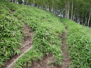 駐車場奥では何かの工事をしています。警備のおじさんはマギー司郎のような、巧みな方言を使ってました。駐車場右側の登山口の道標です。半月山まで距離はわずか800m、標高差も160mほどです。登りはじめると笹原で、踏み跡が疎らですが、どの道を歩いても同じ場所に着きます。