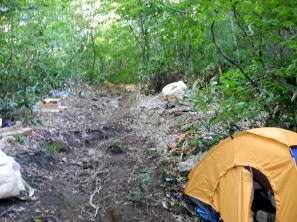 黒沢橋までは緩い登りです。黒沢橋を渡った所で、先に出発した夫婦が早くも休憩をしていました。倒木をくぐると背中のザックが引っ掛かり、弱点の腰をかばいながら、小さくかがんで通り抜けます。