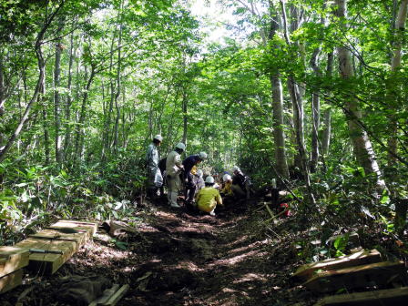 ダケカンバが行儀良く傾いています。 急登のあんこは「ライチョウ平」で、後方には日本海が見えます。木道が随所に敷きつめられた登りをひと頑張りです。