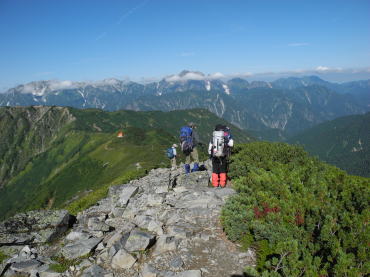 五竜岳へ続く稜線が見えて来ます。キレット小屋から五竜岳までCTで5時間の危険地帯の通過です。しっかりした岩場は通過しやすいですが、ザレ場は滑りますので必要以上に注意を払います。