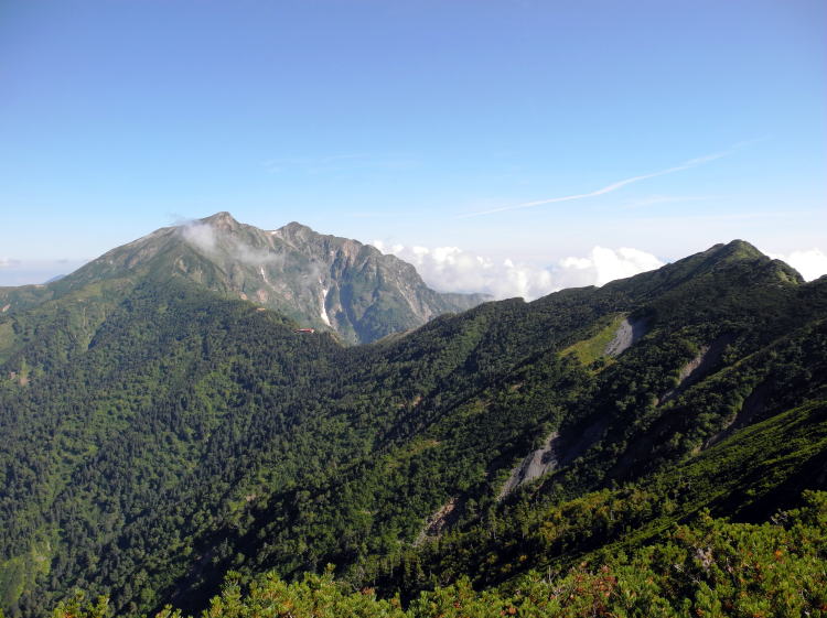 五竜岳のでっかい山容は迫力があります。進行道中の岩場や景色を堪能しながら満足感に浸り、一人ぼっちの険しい稜線を気持ち良く進んで行きます。