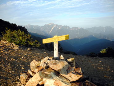 最高峰の中央峰へと向かいます。標爺ヶ岳(2,670m)の最高峰の中央峰ですが、三角点と山頂標識だけの狭いピークに感じました。しかしながら眺望は素晴らしく、雲の切れ間から槍穂等が見え隠れしています。