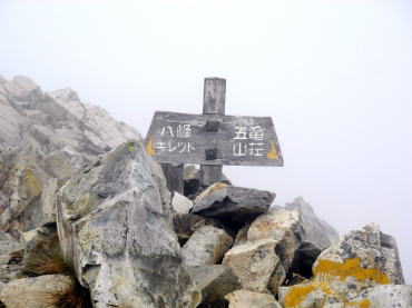 北峰までは今までの山道と違い、岩場を歩きになりますが、難路という程ではありません。右側の雪田を過ぎ、八峰キレットとの分岐の「吊尾根」から一登りで北峰に到着です。山頂標識は割れて、日本語表示の部分は剥がれて無くなっていましたので修理が必要かと思います。キレット小屋に早く付きそうですので、「気さくな男性」と一緒に北峰山頂でケルンを見たりしてガスが抜けるのを待ちますが・・・。「このままキレット小屋では無く、五竜山荘まで行ってみますか?」の声が聞こえます。今回のメインは鹿島槍から五竜へ続く、朝陽を浴びた稜線歩きですので「イイエ」の返答をしました。※因みに「気さくな男性」は健脚者で、上高地から槍へ登り槍ヶ岳山荘で一泊してから大キレット通過し、北・奥穂を経由して、余裕で重太郎新道を下がって来るスペシャリストですので、頼もしく感じました。
