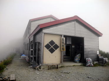 岩場とガレ場を急降下して行くと、五竜山荘泊のハイカーと8人ぐらいすれ違います。五竜山荘の中に入り、ひと息です。本日の天気予報は、曇り時々晴れですが・・・。