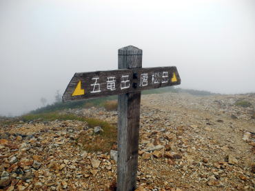 山頂は貸切!と思いきや、目の前に大人しいイワヒバリが寛いでいました。寒くなって来ましたのでジャケットを羽織り、分岐に戻ります。ガスの中、五竜山荘へと標高を下げて行きます。