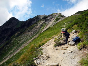 鹿島槍ヶ岳への登りは歩きやすく、白や緑や黄色や茶色に染まった稜線が、品良く伸びています。女性に人気の山だとやけに納得しながら標高を上げて行きます。