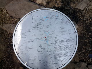 子持山山頂に到着です。山頂は樹林に囲まれて、片側の展望は良く見えませんけど、360度の展望版があります。ガスり気味で北東方面もイマイチでした。山頂には十二山神が祭られており、一等三角点が置かれています。ここでやっとこ、味噌汁とおむすびを頂きます。