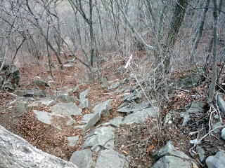 太鼓橋を渡ると目の前には巨大な屏風岩で、右の沢沿いに進みます。やがて杉林の中の登りになりますが、地元の中郷小の小学生が書いた「がんばろう」や、小鳥の木札があちこちで見うけられ元気を頂きます。周辺が雑木に変わり、滑りやすい急坂となり、6号からの合流点の尾根にでます。