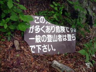少し行くと中之岳神社と金洞山の分岐にでます、必要以上に危険・注意・滑落死亡事故多しの立て看板があります。