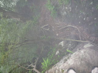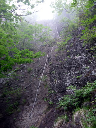 途中、凄い霧の中を歩いていたら何時の間にか山道から外れて、5分位場所が分からなくなってしまいました“冷汗!”こうなると来た道を戻るほか、手段はありませんが、何故か違う道を歩いていました。やがて2ヶ所の鎖場を通過して行きます。