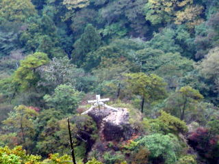奥ノ院右下の岩壁に鎖が垂れ下がっています。いよいよ鎖場が連続する上級コースが始まります。緊張感を味わいながら難なく登りこみます。連れもゆっくりですがしっかり付いてきます。やがて眺望の良い場所に到着ですが、近郊の眺望しかありません。