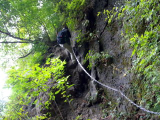 大のぞきから下を覗き込むと長い鎖が下まで垂れ下がっています。すべり台状の長い鎖場を一挙に下がり終えると、連れは慎重に下っていますのでなかなか辿り着きません。
