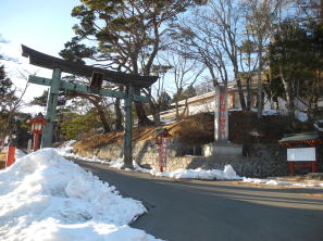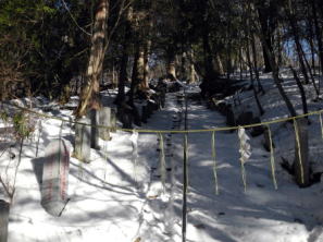 急坂を登り切った場所にある、八合目の「瀧尾神社」です。八合目を過ぎた辺りから、傾斜はやや緩くなります。あるはずの丸太の階段は積雪で埋まり、見えません。