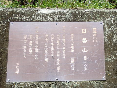 | 日暮山(にっくらやま)は、日暮山トンネルの真上に聳える山で、整った山容から「矢川富士」とも呼ばれるほか、馬の荷鞍に似ていることから「荷ぐら山」ともいう。石宮や石碑が祭られており、信仰の山であった名残をとどめる。 |