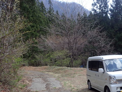 水切りで人工的に抉られた走り難い林道を進んで行くと、駐車スペースがあります。先行者と思いきや、山菜取りのご婦人でした。そして最短距離でスタートです。