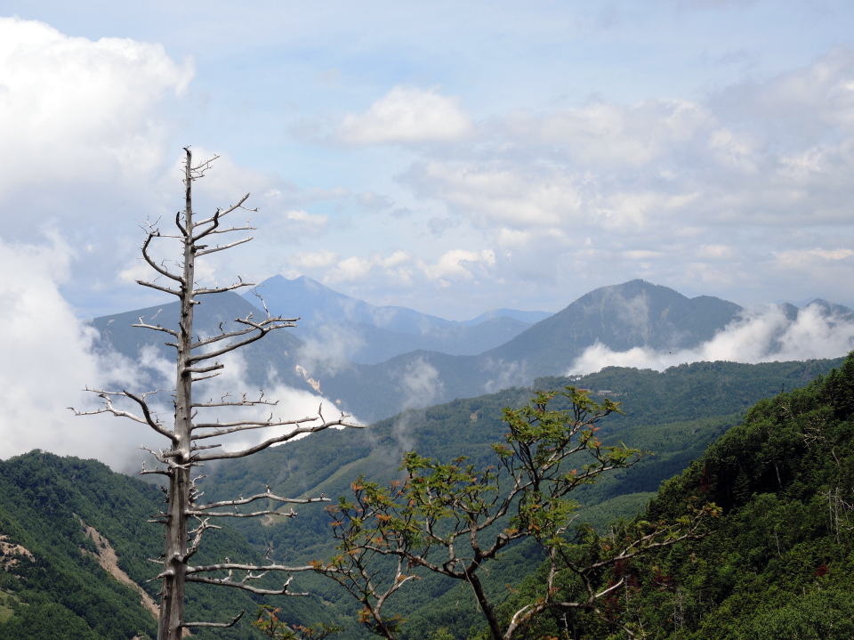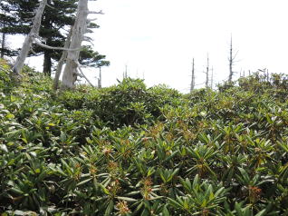 ザレ場に出たら少し進んで左の笹藪へ入って行き、笹や枝を掴みながら急な斜面をジグザクしながら登って行きます。※以降は写真を撮る余裕が無かった為、ひと息ついた状態の写真のみ! やがて急斜面の枯木帯へ突入!木を掴むとボキボキ割れて調子抜け! やがて緩やかになってシャクナゲ混じりの藪漕ぎになります。