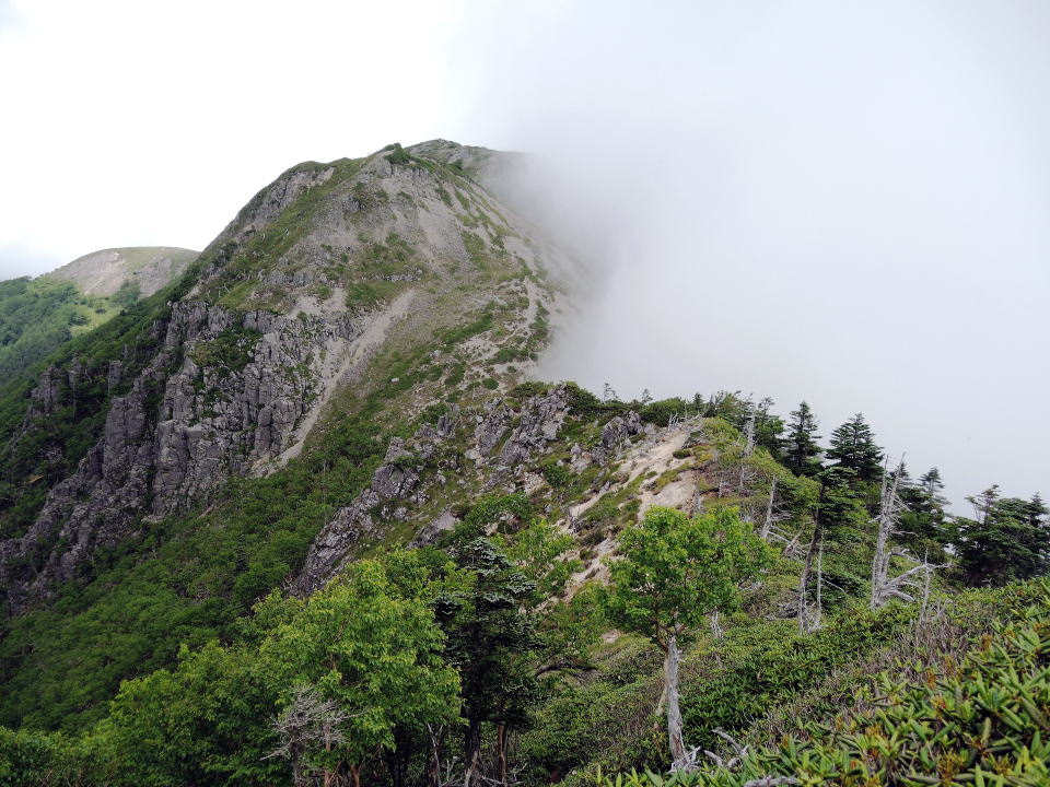 露に濡れた熊笹を掻き分けての歩行だったので、知らぬ間にズボンはびっしょり!遅ればせながらゴアとスパッツを装着です。 ワイルドな樹林帯へ入ると少し歩き易きなりスピードアップ!火口原より貸切歩行でしたが、本日初めての方とスライド!避難小屋泊で早朝からの出発だったそうです。ちなみに水場は枯れていたそうです。