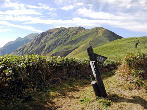 巻機山へと続くジャンクションピークでは、まだまだ巻機山が遠くに見えます。ちなみに巻機山の看板には・・・『難路・道ナシ』と書いてありました。少し踏み入れると、藪こぎで歩かれた跡がありました。朝日岳山頂まで残り、15分ぐらいです。