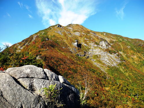紅葉に染まった朝日岳へ続く稜線歩きは心地良く、1年前に下がった同じコースとは思えない、変身ぶりです。