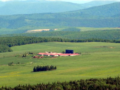 振り返って眼下に、吹上温泉保養センター白銀荘が見えます。近くにある吹上露天の湯は、ドラマ「北の国から」で、宮沢りえsanが撮影のため入浴したことで一躍有名になった混浴無料露天風呂です。右には、雲海越しに夕張岳が凛々しく見えます。