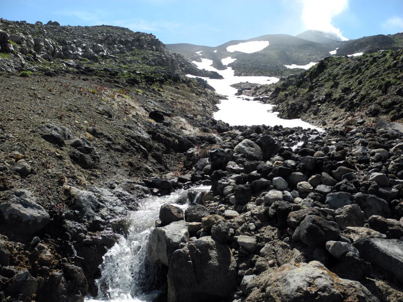 十勝岳より雪融け水が爽快に流れています。沢の流れる音と共に涼しさも一緒にやって来ますので、しばし立止ります。